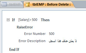 قمت بتصميم هذا الماكرو لمنع حذف سجل أي موظف راتبه أعلى من 500 دينار على سبيل التجربة، وقد استخدمت القاعدة الشرطية IF وأمر RaiseError الذي يمنع حذف السجل إذا تحقق الشرط. الصورة التالية توضح طريقة عمل الماكرو: