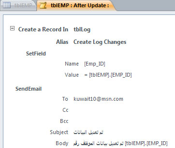 قمت بتصميم هذا الماكرو لتسجيل التغييرات عند تحديث سجل ما وحفظ هذه التغييرات في جدول آخر أنشأته هو جدول tblLog، ليس هذا فقط! إستخدمت أيضا أمر SendEmail والذي يقوم بإرسال رسالة إلكترونية لبريدي الإلكتروني في حالة تحديث السجل، أليس هذا رائعا؟ الصورة التالية توضح طريقة عمل الماكرو: