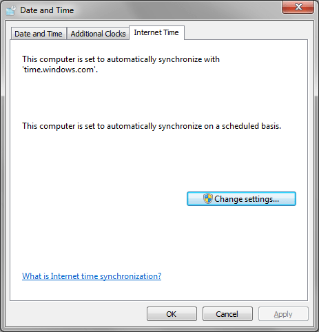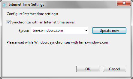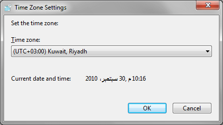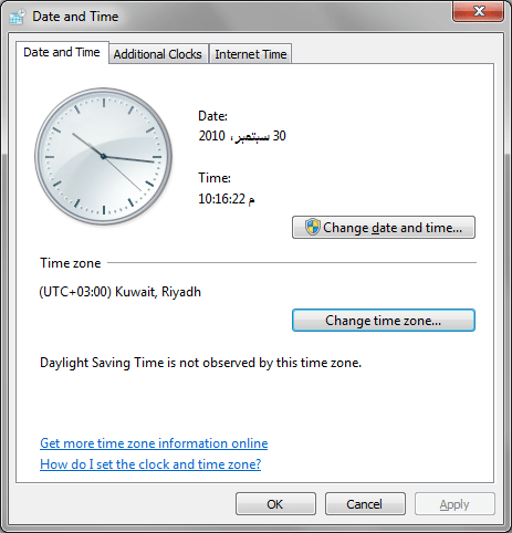 في مربع حوار التاريخ والوقت، أنقر فوق "Change time zone".في مربع حوار إعدادات المنطقة الزمنية، غير المنطقة الزمنية إلى ما يناسبك (مثلا توقيت الكويت هو: UTC + 03.00)، ثم أنقر فوق زر موافق.في مربع حوار التاريخ والوقت، أنقر فوق علامة تبويب "Internet Time".في علامة تبويب وقت الإنترنت، أنقر فوق "Change settings".في مربع حوار إعدادات وقت الإنترنت، حدد خيار " Synchronize with an Internet time server"، ثم انقر فوق أمر "Update now"، ثم أنقر فوق موافق.