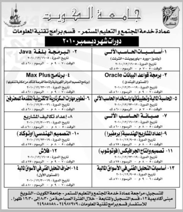 ارجو تزويدي بكل ما هو جديد من دورات تدريبية في جامعة الكويت لعام 2011