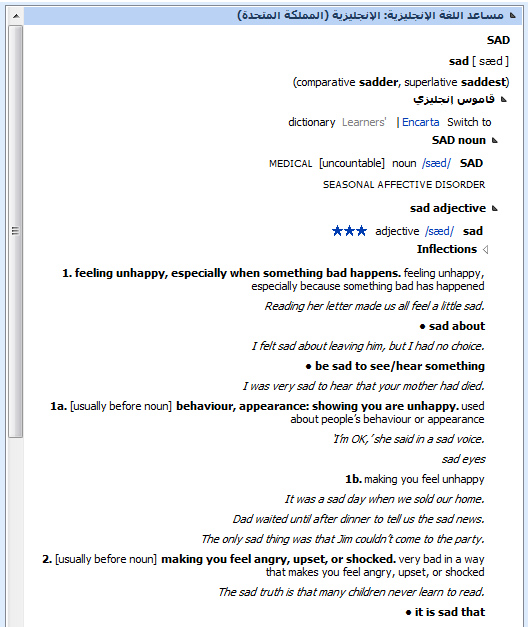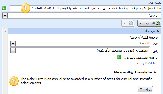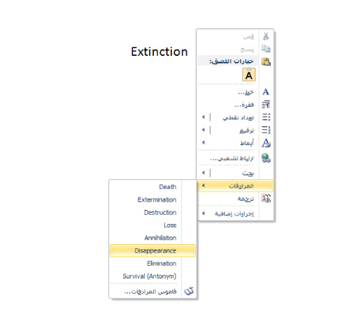 بوجهة نظري هي الأداة الأقوى في Microsoft Word وتستخدم في البحث عن الكلمة الإنجليزية في موسوعة Encarta الإلكترونية وقاموس Advanced Learner’s Dictionary (التي تحتوي على 100 ألف كلمة باللغة الإنجليزية)، ومن خلالها ستتعرف على معاني ومرادفات واستخدامات مفردات اللغة الإنجليزية بأسلوب علمي رصين. الطريقة: فقط ظلل على الكلمة ثم انقر بالزر الأيمن للفأرة، واختر “بحث” ثم “مساعد اللغة الإنجليزية:الإنجليزية”.