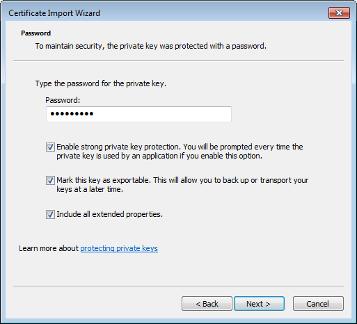 * في هذه الخطوة ستظهر لك بعض الخيارات المتقدمة، مثل خيار تمكين الحماية القوية للمفتاح الخاص (المطالبة بإدخال كلمة المرور في كل مرة يتم فيها استخدام المفتاح الخاص)، وخيار تمكين أمر تصدير الشهادة الرقمية.