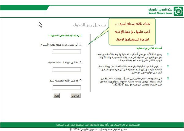 وهكذا كلما دخل العميل إلى خدمة “التمويل أون لاين” تظهر له الصورة التي اختارها والعبارة (الوصف) التي قام بكتابتها (هذا يؤكد للعميل أنه ضمن الموقع الرسمي لبيتك)، ومن ثم سيطلب منه الإجابة على أحد الأسئلة الأمنية التي سبق له الإجابة عليها (هذا يؤكد لبيتك أن العميل مخول بالإطلاع على بياناته المالية)”.