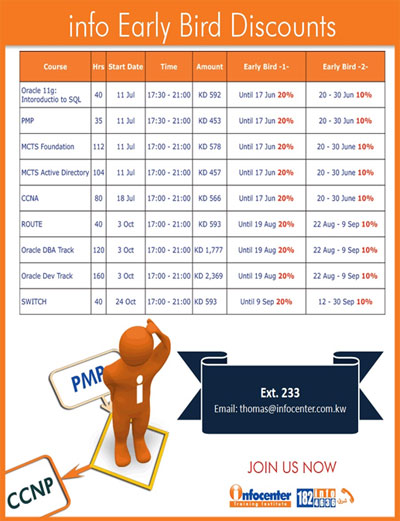 فيما يلي خطة دورات جامعة Oracle للنصف الأول من 2012، جميع الدورات ستعقد في معهد أنفو سنتر (InfoCenter) والكائن في مجمع الخليجية بمنطقة شرق، وهو مركز تعليمي معتمد من Oracle وحائز على جائزتهم لمدة 3 سنوات متتالية. بالنسبة لي فأنا لحسن حظي التحقت بـ 9 دورات Oracle، أغلبها كانت في معهد أنفو سنتر وبعضها في خارج الكويت. لمن يبحث عن دورات أخرى لـ Oracle فمعهد New Horizons في دبي يقدم الكثير من الدورات المتخصصة غير المتوفرة بالكويت.